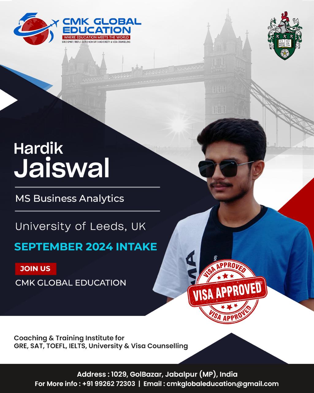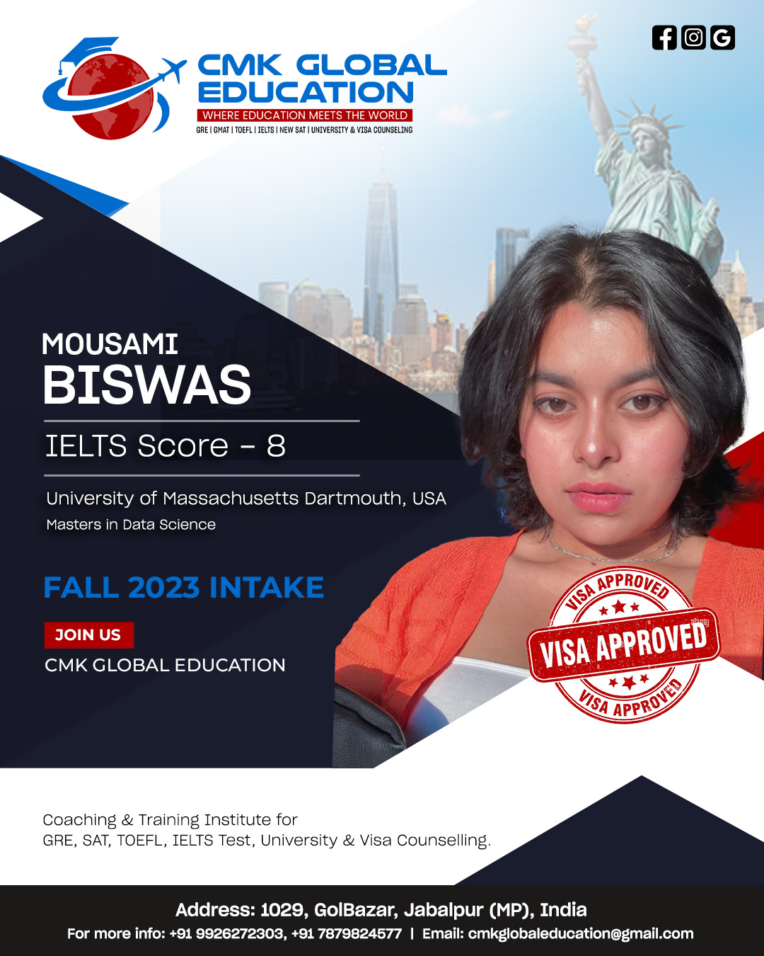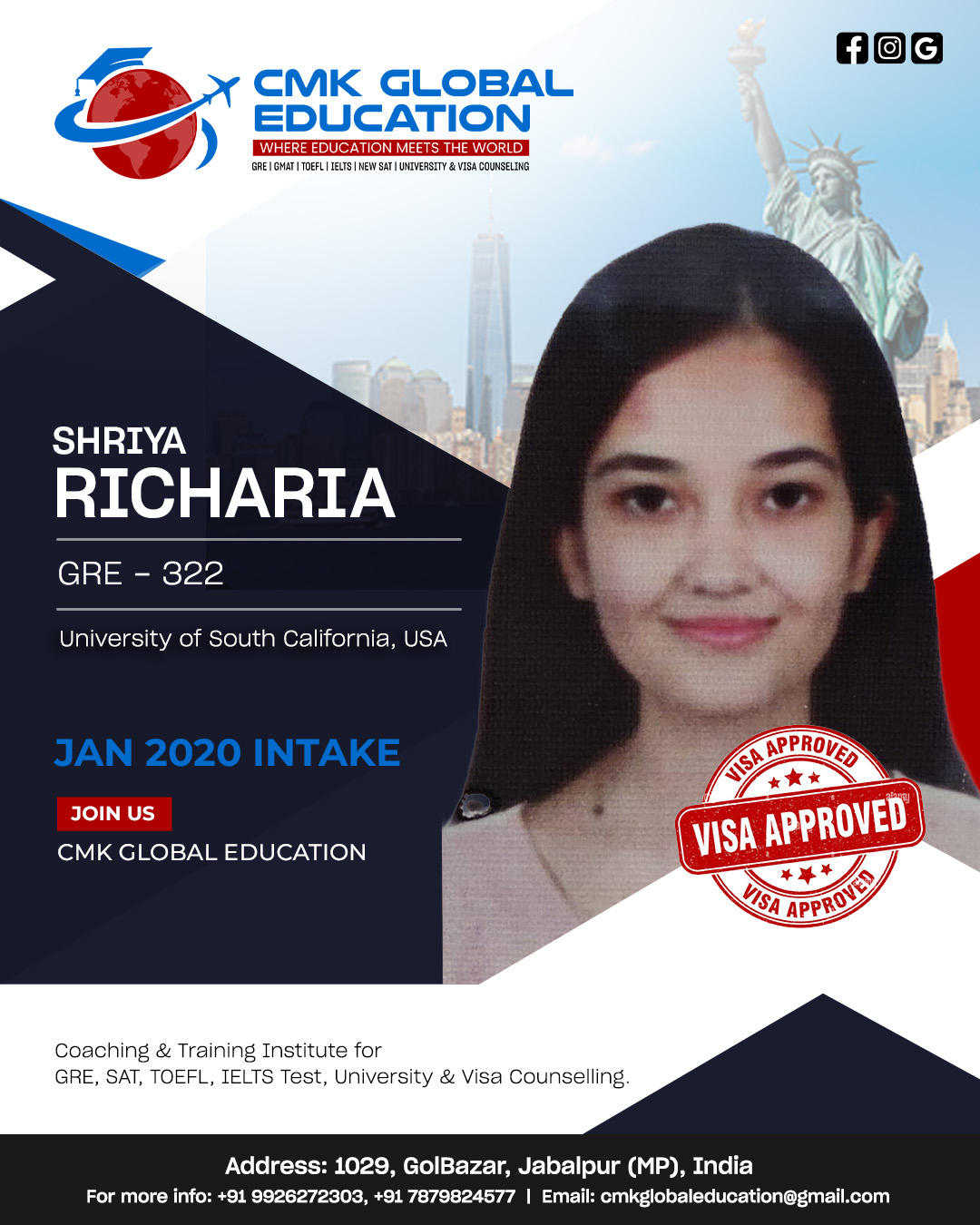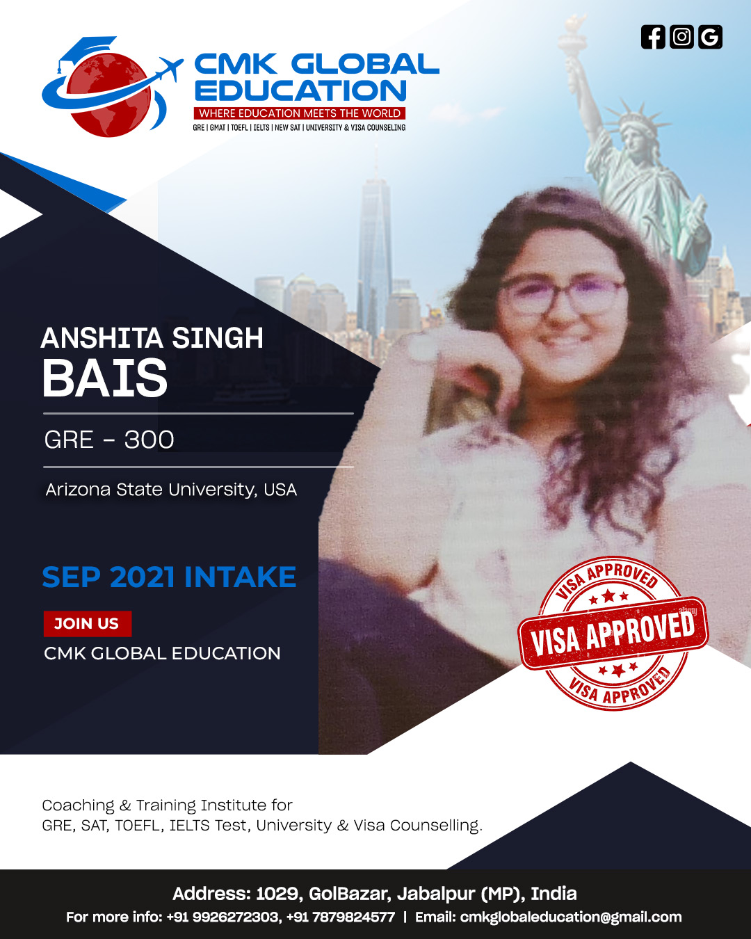 Choosing CMK for my study abroad career was one of the best decisions I’ve ever made. Charu ma’am helped me with everything from the short listing of unis till i received my US VISA. Unlike any other counsellors or study abroad services, she was always available for me whenever i needed guidance. Her team is amazing. They guided me throughout my GRE prep, helped in SOP writing and everything else. Initially i was aiming to study in canada but after viewing my academic profile, she guided and motivated me to pursue my Masters degree in the US which i thought was out of my league. Apart from career counselling, she is one of the most approachable, compassionate and experienced people to help you with your career journey. I strongly recommend Globalizers Jabalpur to anybody who’s planning to study overseas.
