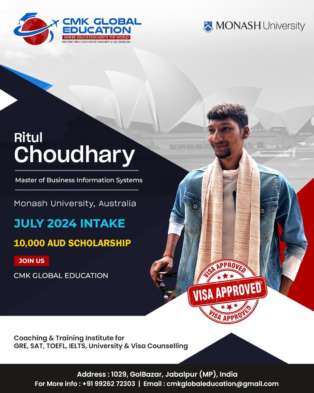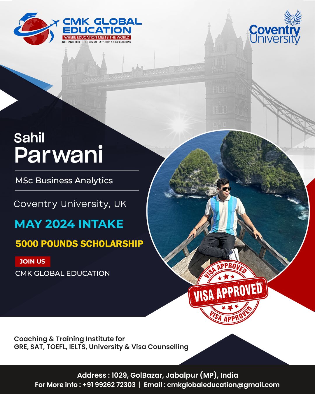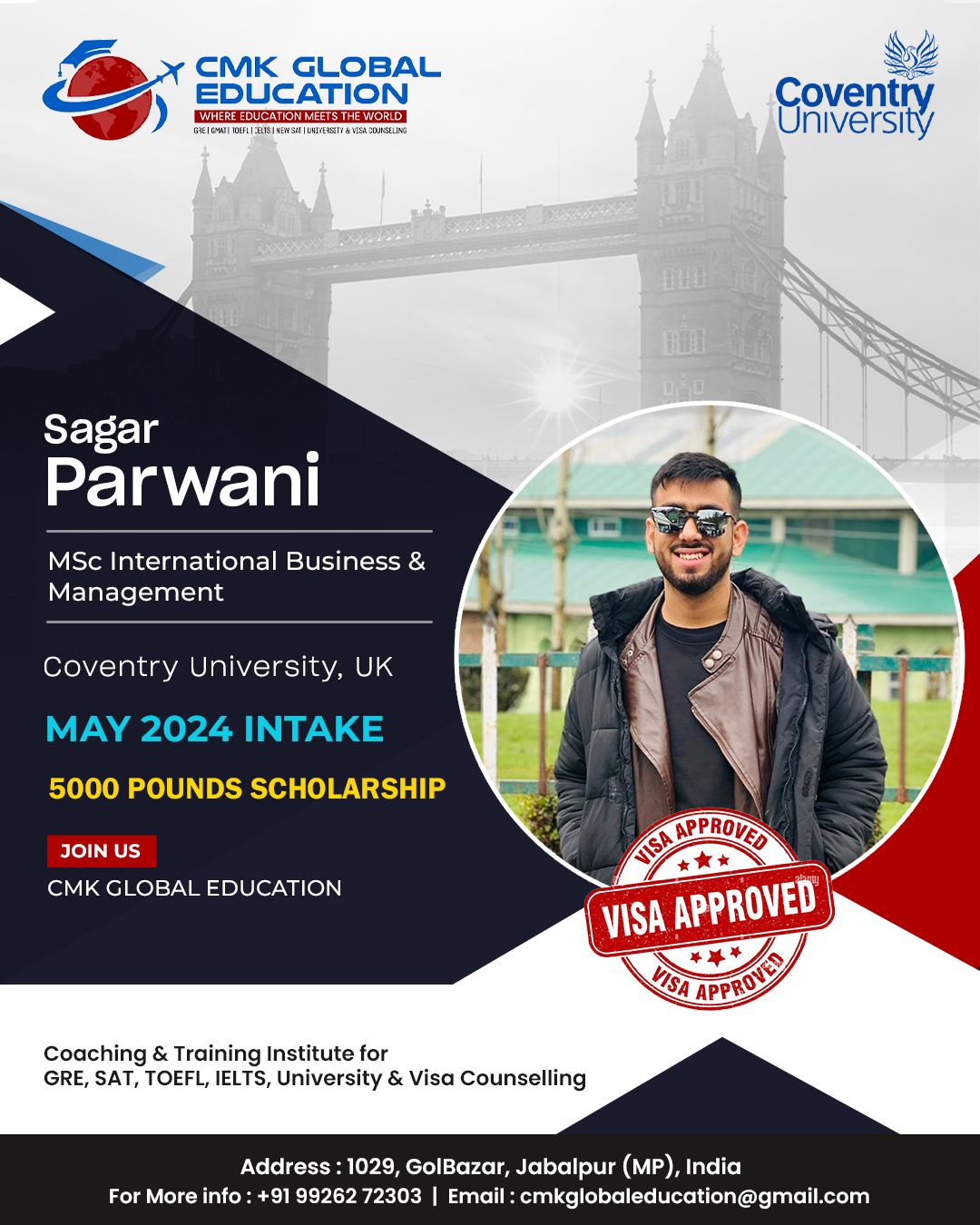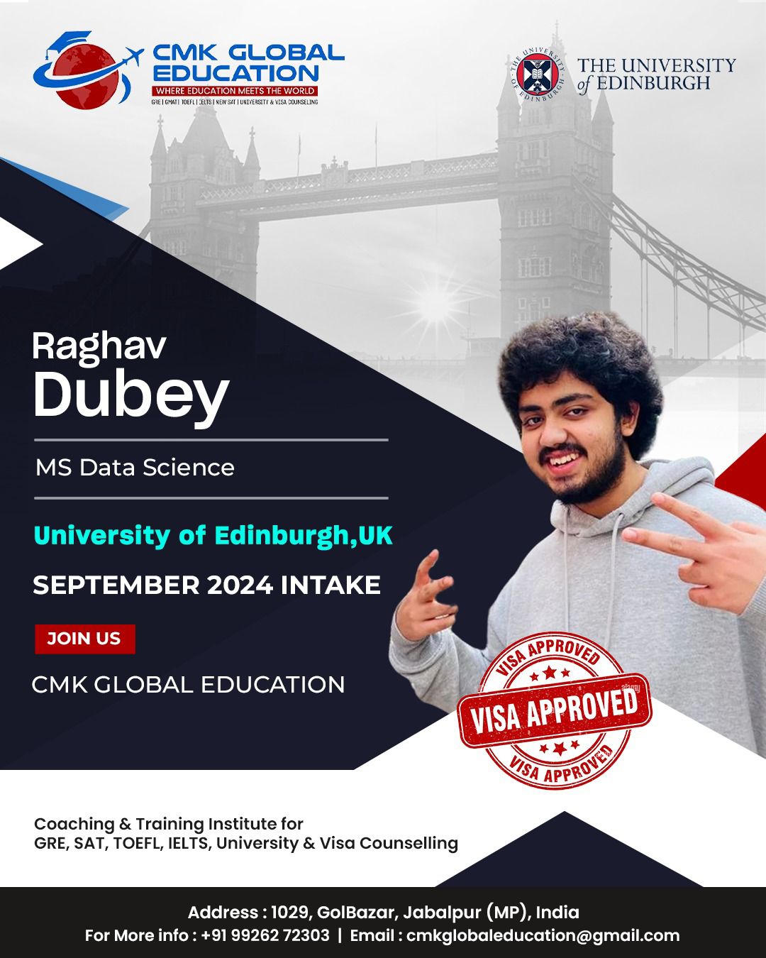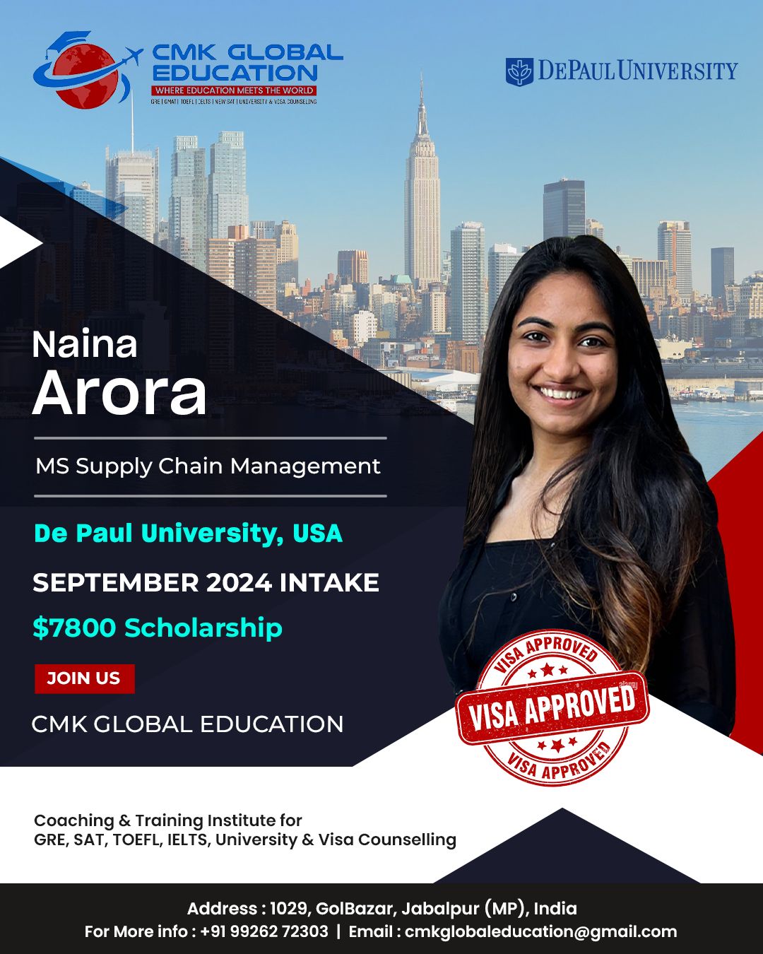 Choosing CMK for my study abroad career was one of the best decisions I’ve ever made. Charu ma’am helped me with everything from the short listing of unis till i received my US VISA. Unlike any other counsellors or study abroad services, she was always available for me whenever i needed guidance. Her team is amazing. They guided me throughout my GRE prep, helped in SOP writing and everything else. Initially i was aiming to study in canada but after viewing my academic profile, she guided and motivated me to pursue my Masters degree in the US which i thought was out of my league. Apart from career counselling, she is one of the most approachable, compassionate and experienced people to help you with your career journey. I strongly recommend Globalizers Jabalpur to anybody who’s planning to study overseas.