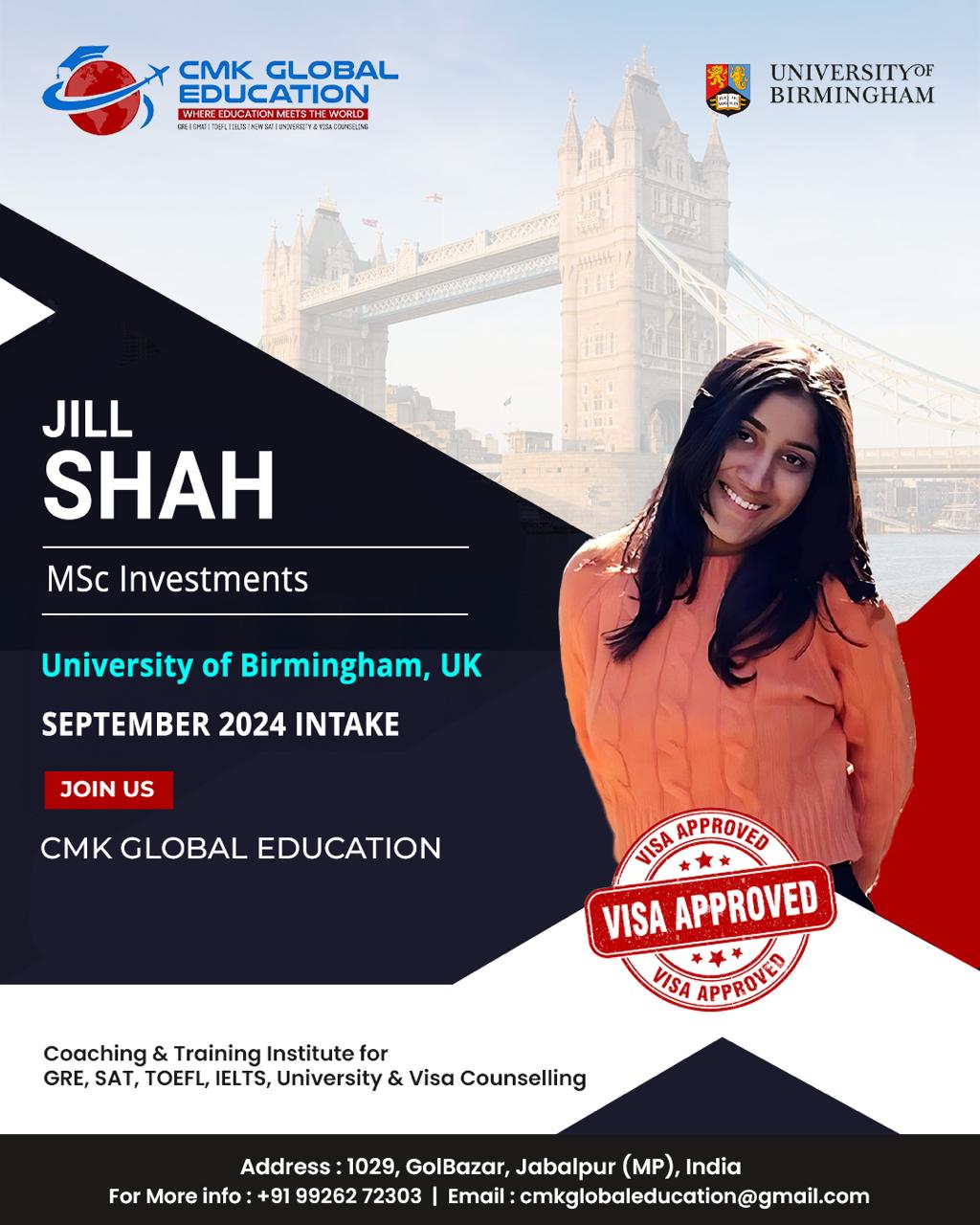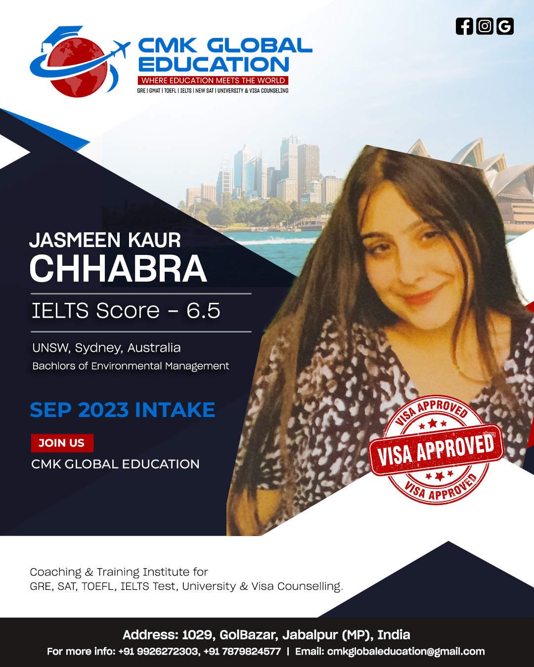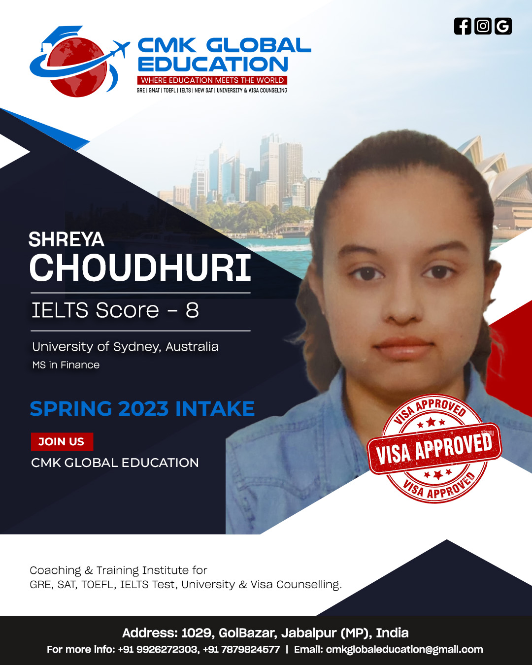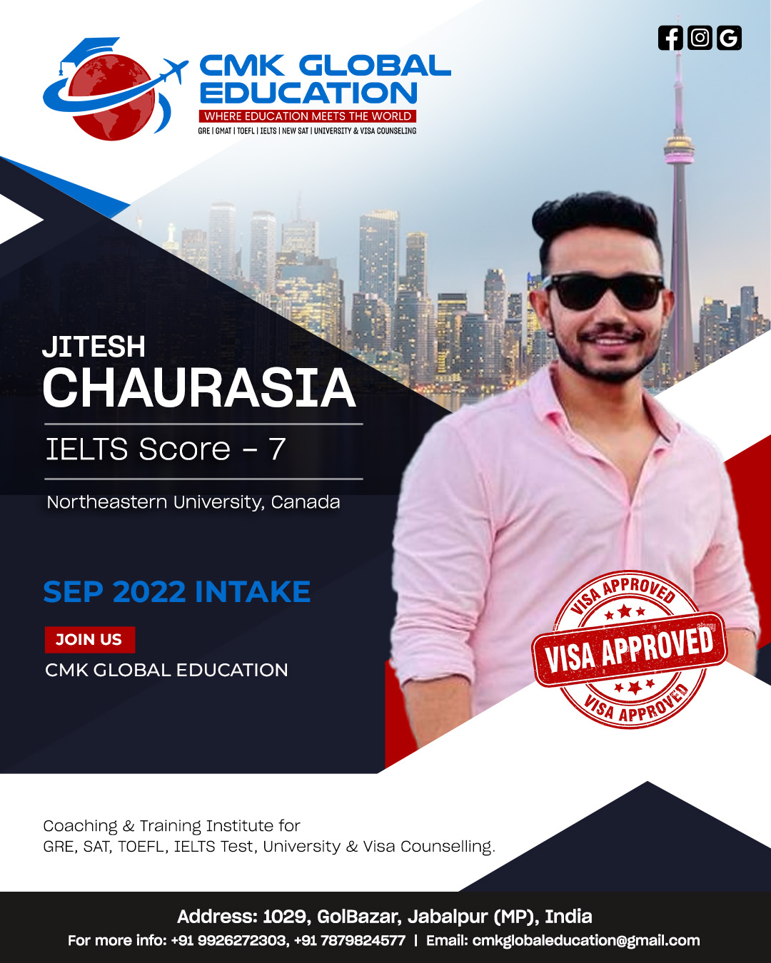 The best institute in Jabalpur for IELTS and consultation. Mrs. Charu Kohli ma’am has helped me immensely throughout my study abroad journey. From college applications to the visa process, she was very generous and helpful and made my life so much easier. She always had a positive outlook and helped me achieve my dream university. I am very grateful for her assistance. If you want to kick start your study abroad journey, definitely visit CMK Global Education. I am glad I chose them over any other institute. I assure you will have zero regrets.
