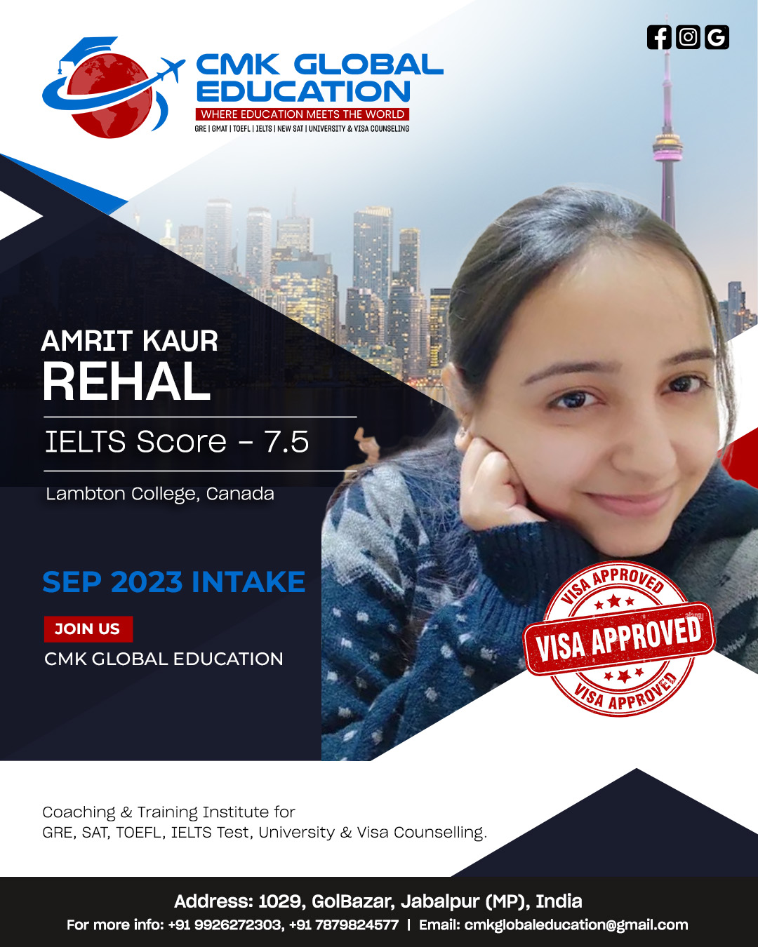 I recently had the pleasure of working with CMK Global, and I cannot express enough gratitude for the exceptional support and genuine care I received throughout my IELTS training to nerve wracking visa process. Thanks to Charu Kohli Mam’s unwavering dedication and personalized attention, every obstacle was overcome with ease. It was evident that she treated my journey as if it were her own, ensuring that no detail was overlooked. In the end, I received my visa approved. I highly recommend CMK Global Abroad Consultancy to anyone seeking guidance and support in their educational endeavors.