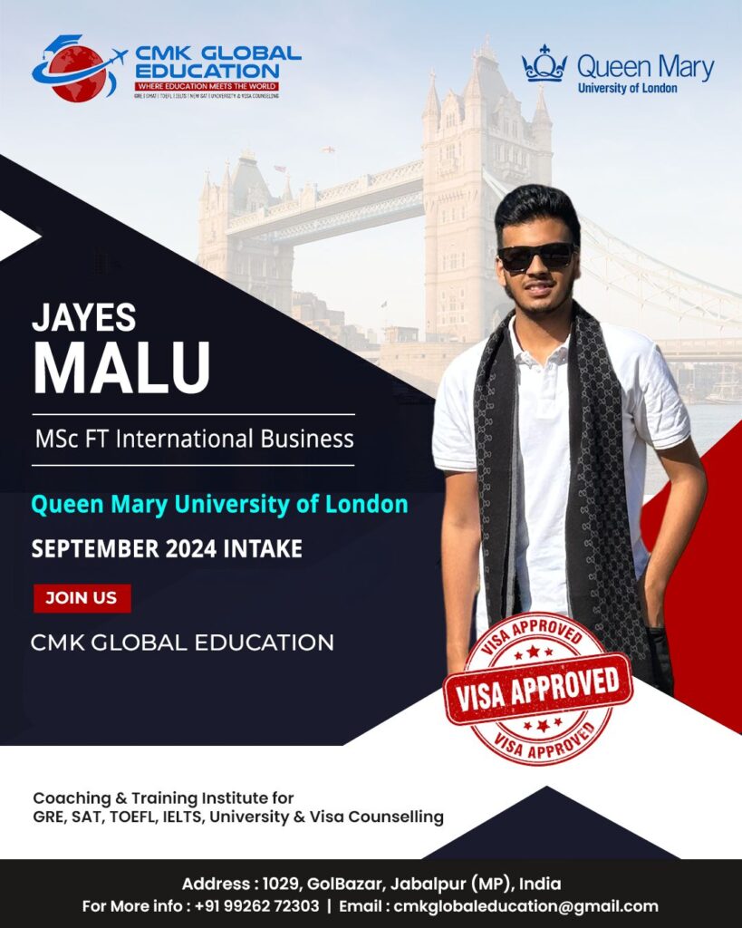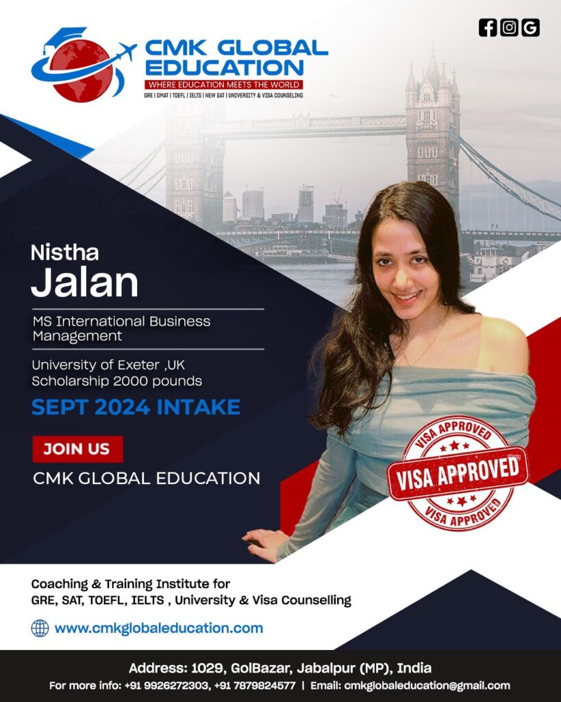 CMK Global Education is the best institution in Jabalpur city for preparing IELTS and for every other process which is required for studying abroad. When I was searching for IELTS institution in town CMK Global Education and Charu Kohli ma’am ‘s name came across on top with best Google reviews. I wasn’t disappointed when I joined the IELTS classes. Charu ma’am takes care of each and every aspect of IELTS well, be it Reading, Writing, Listening, Speaking.